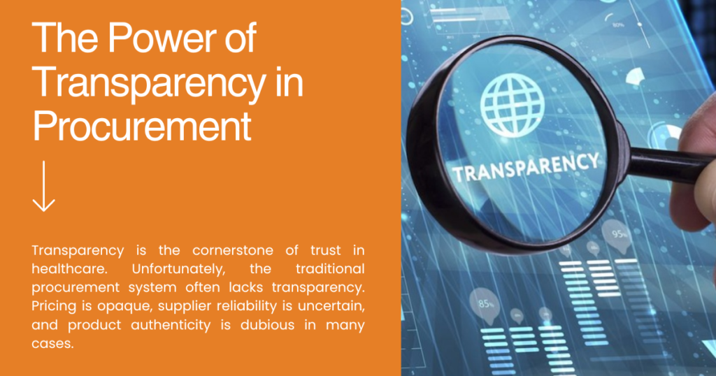 Transparency is the cornerstone of trust in healthcare. Unfortunately, the traditional procurement system often lacks transparency. Pricing is opaque, supplier reliability is uncertain, and product authenticity is dubious in many cases.
